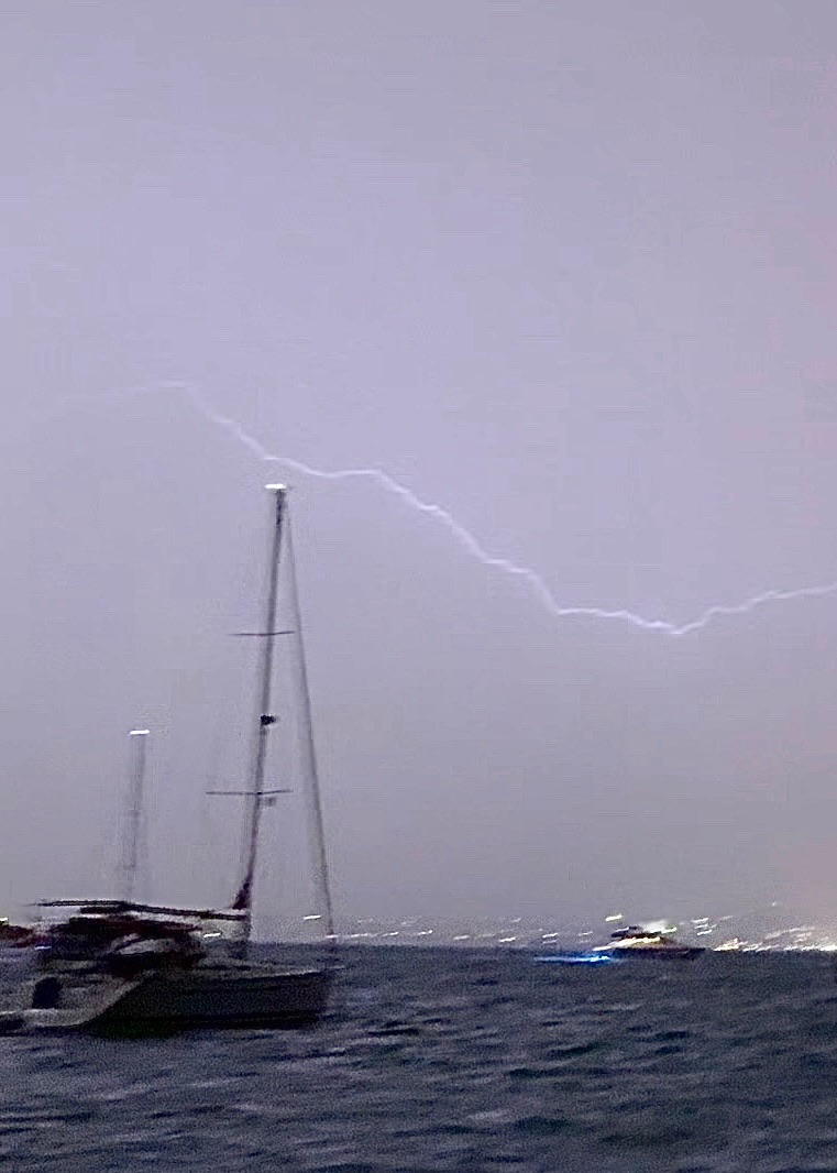 At last the wind dropped so at about 2200 we went to bed. An hour later, someone was outside with a flashlight, or so we thought. Bleary-eyed from having just dropped off to sleep, we realised it was lightning. Thunderstorms are never good on a boat, as not only do you have a massive metal pole sticking up but they can bring strong gusty winds with them. You've heard about the Bayesian, I suppose. Most of the thunderstorms we've encountered on the boat have brought a downpour of rain and strong winds, so we were up out of bed with our waterproofs on, just in case.