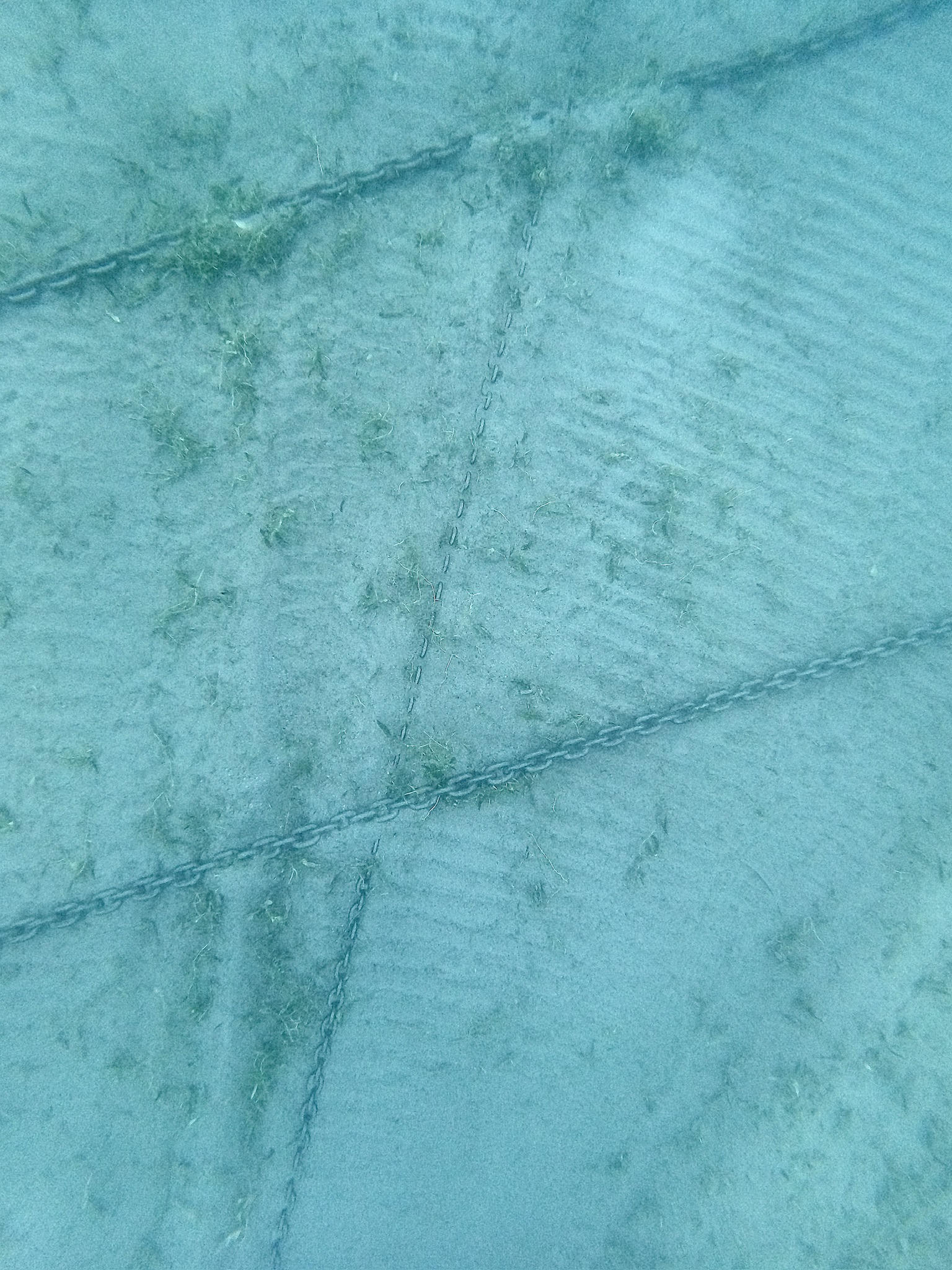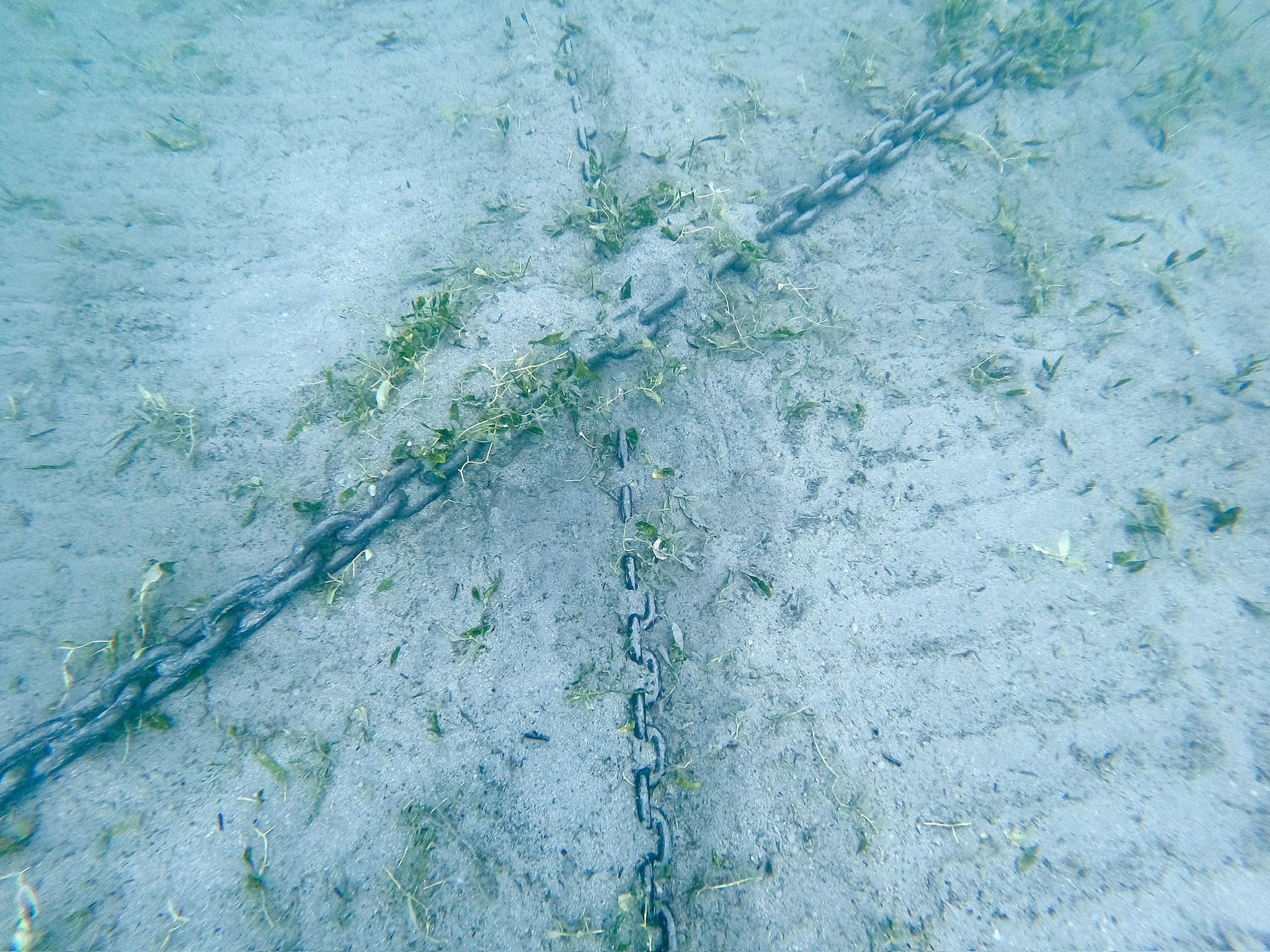 As we were in the cockpit, a huge superyacht came in. He drove between us and our neighbour with his anchors dangling in the water. Surely he wasn't going to anchor here?! But yes, surely he was. Just off our bow, and despite our protests, he dropped both anchors. Frantic arm waving ensued, with us signalling he had laid his anchor chain over ours, signalling that he definitely had not. There was only one way to find out. Armed with the GoPro I got in the water and lo and behold, he had laid not one, but both his chains over ours. This meant we couldn't leave. We weren't planning to anyway, as we're meeting a friend on a neighbouring island tomorrow, but we might have wanted to. I swam over to the superyacht and told one of the crew, who said he'd tell the captain immediately and come over to us.