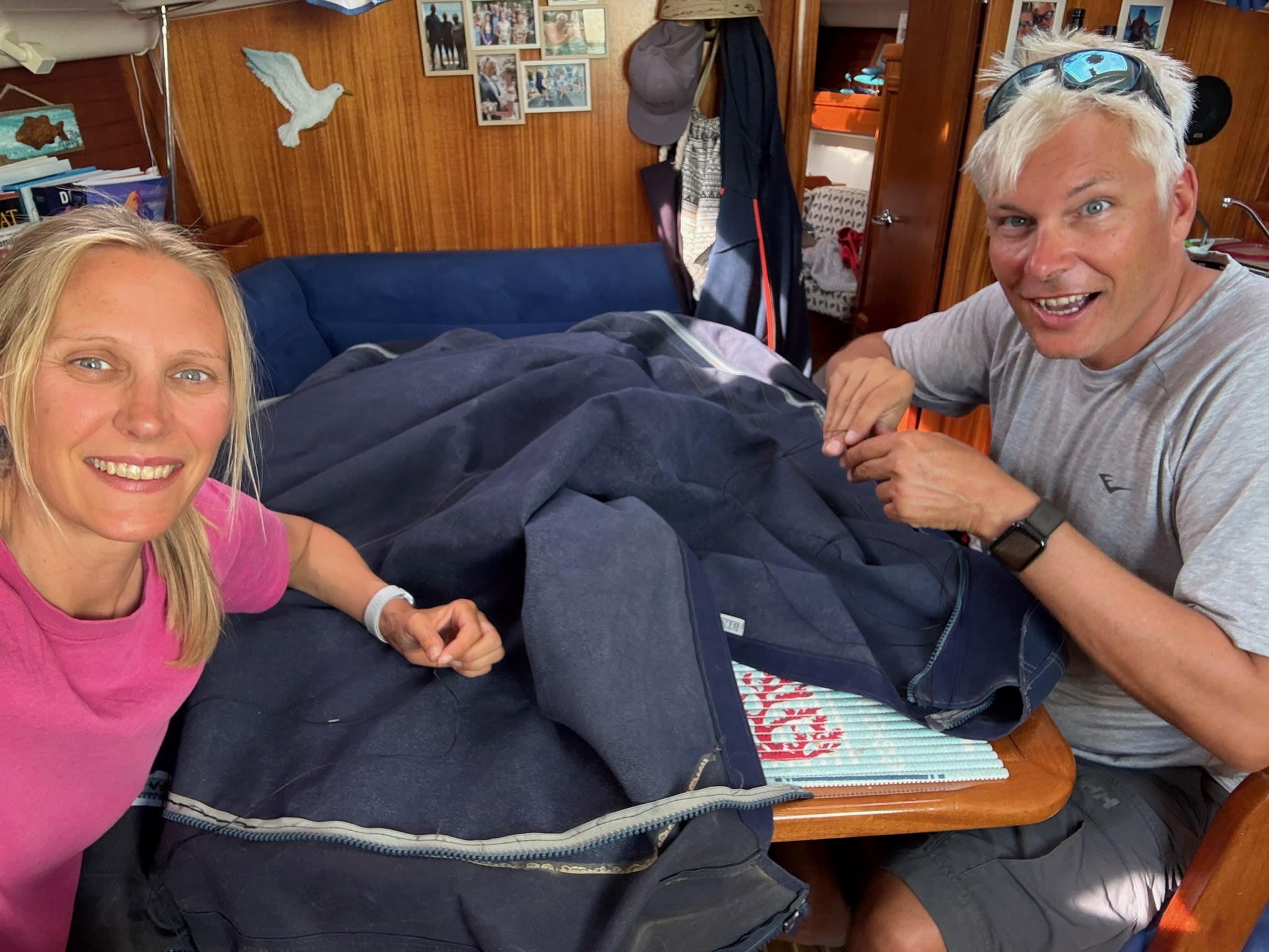 We'd got used to the regular noises, but then we heard a different sound. Predictably, it was the bimini. We went on deck to find it flapping violently in the wind, the stitching on the zips coming apart so we had no choice but to dismantle it. Shouting instructions to one another, we managed to get it down without losing an eye, but in the process, Tom's glasses were whipped off his head and into the sea! We dragged the dusty canvas into the cabin, hit play on the iPad and stared at the anchor alarm.