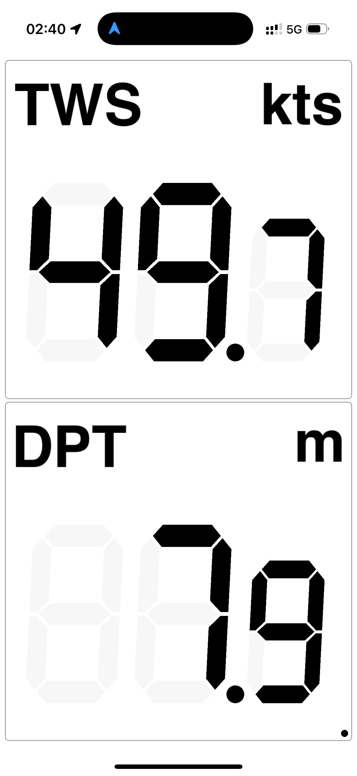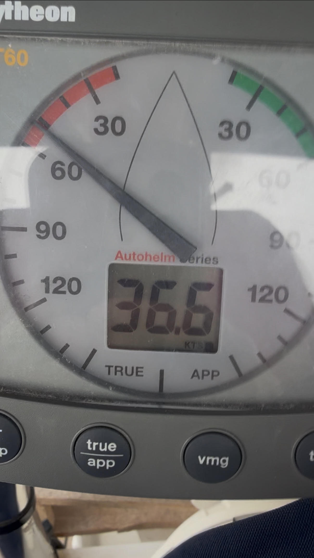So up we were again. We turned on the wind instruments so we could check the wind speed — we were up to 30 knots already. This wasn't due for another few hours yet. One of the weather apps we use (Windy) reports actual wind speeds from ships and weather stations and there was one in the south of the bay. I looked at it and saw it had reported wind of 32 knots, and a gust of what looked like 11 knots. Seemed low so I zoomed in and to my horror, I realised it actually said 111 knots — hurricane force 12! This freaked us out as this was vastly more than we were expecting. The gusts were very violent now. The roaring wind sent a high-pitched whistle through the rig, a spray of water over the decks and leaned the boat over to one side, so much so that everything on the counter ended up on the floor (our fourth French press of the season was a goner!). The wind speed meter read almost 50 knots. This really wasn't good. I just remember saying over and over, "this is awful". Not helpful!