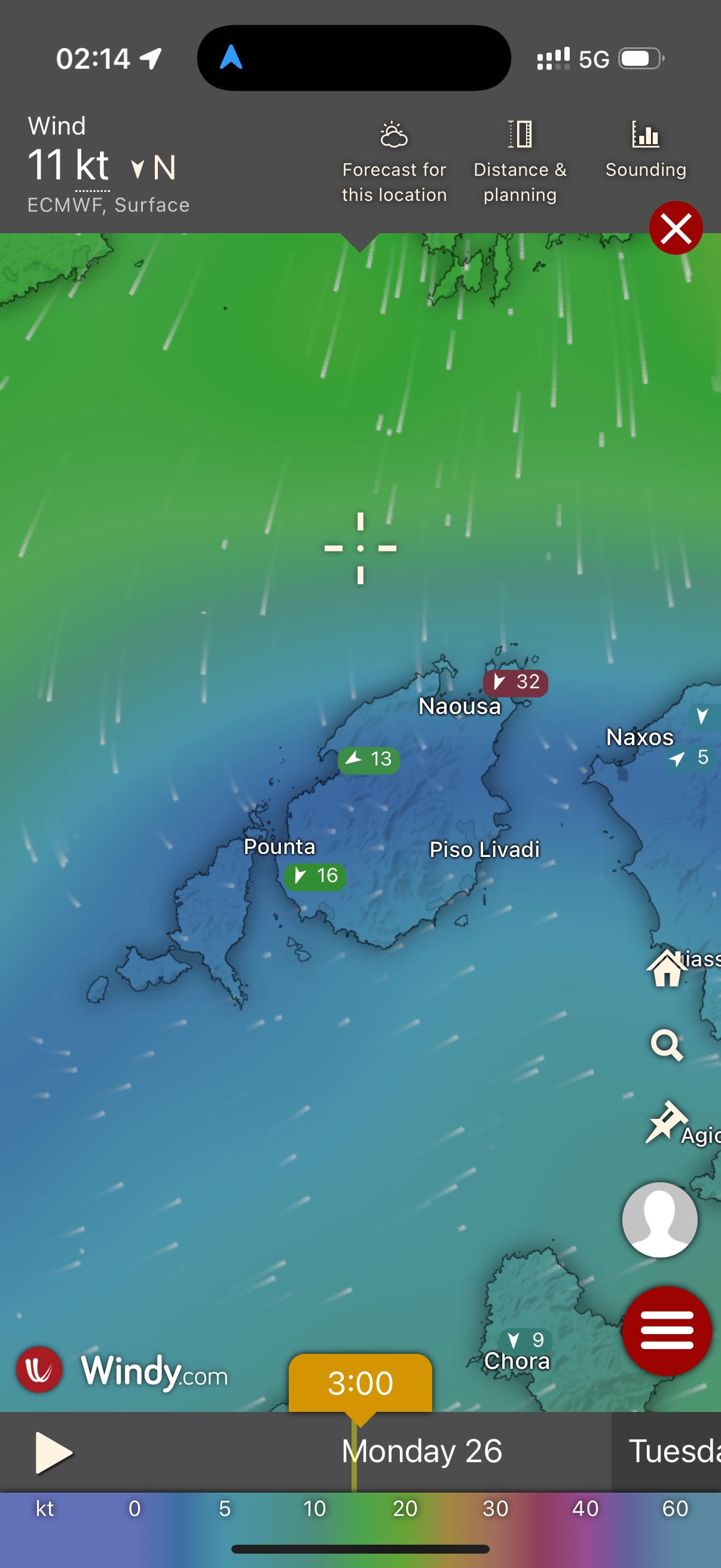 Yesterday was one of those days when they all disagreed and never converged. Roughly, it looked like we'd get southerlies during the day then, within the space of a few hours, it'd switch to northerlies overnight. This 180-degree shift is always tricky to plan for, as an anchorage protected from the south won't be nice when the wind turns to the north. Lucky for us we're in a big bay in the north of Paros, called Naousa, which has plenty of options.