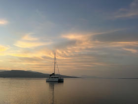 After much faffing to get a few boxes of personal stuff delivered to Bini, we're finally making our way into the island. Just to discover that the boat has sprung a leak.